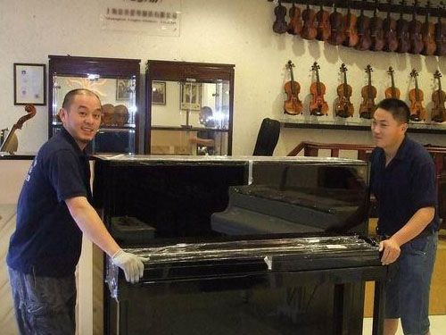 3、搬運鋼琴有技巧,如果鋼琴需要搬運上樓,需派四至五人搬運,兩人在下,三人在上,用寬布帶挎在肩上兜住鋼琴的車腳。同時用手抓住琴背的把手和鍵盤底下(不能拉鋼琴的腿),抬起鋼琴一鼓作氣搬上一層樓再休息。特別要注意的是,鍵盤的一側不能碰扶手,車腳不能碰樓梯。到一層樓面拐彎時要當心碰撞、調整好方向然后再抬起往上搬。進房門時,也要當心蹭著門框,保證最后安全地把鋼琴放到安排好的位置上。若需把鋼琴搬運上廂式貨車,由于立式鋼琴的重心靠近后背,琴后背的人數要比琴前的人多,往車上抬時,前面三個人,后面兩個人,后面的人抬起頂住,前面的人抬鋼琴的底部,抬起放到車上,然后上去一個人往車箱上拉,后面的人往車箱內推,這樣就能把琴搬上車了。
